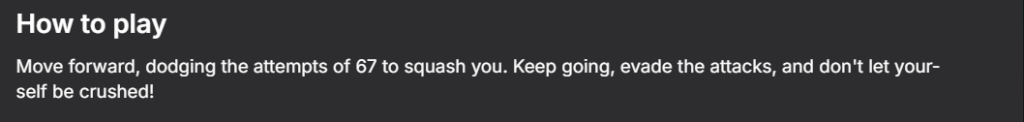 Don’t Get Crushed by 67: Obby is a fast-paced obstacle game that tests your timing, focus, and nerves. Race through a series of challenging stages where massive objects move, fall, and slam down without warning. One wrong step—and you’re crushed.