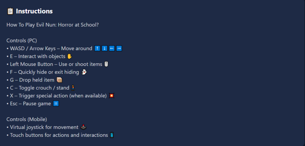 Hide under desks, inside lockers, or in shadowy corners while planning your next step. With multiple difficulty levels, different escape routes, and unpredictable AI behavior, Evil Nun: Horror at School delivers a tense and immersive horror experience where every decision matters. Will you outsmart the nun and break free… or become another lost soul trapped within the school walls?
